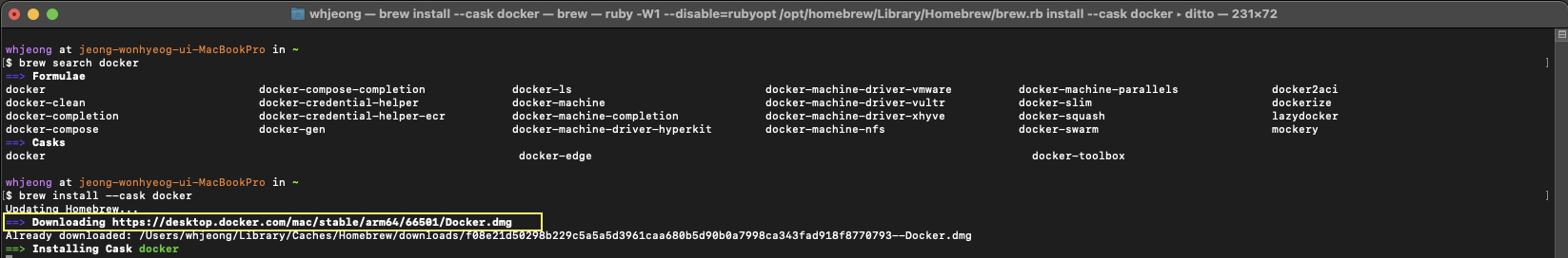 위의 이미지에서 homebrew 가 설치 중인 Docker는 arm64 버젼의 Docker dmg를 다운받는 모습을 보고 안심했습니다.